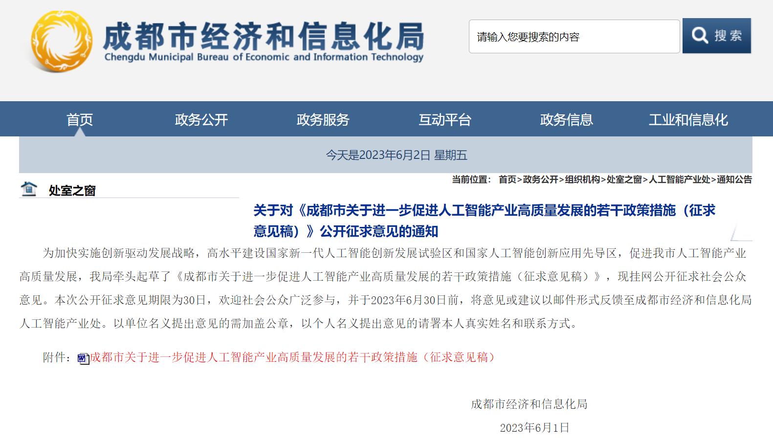 6月1日,四川省成都市经济和信息化局发布通知,对《成都市关于进一步促进人工智能产业高质量发展的若干政策措施(征求意见稿)》公开征求意见。