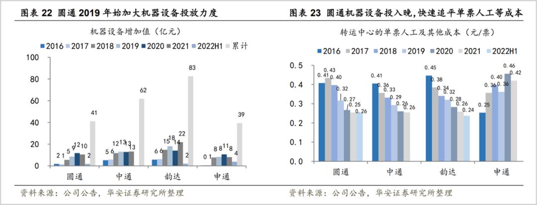 据华安证券研究,2016年至2018年,圆通的机器设备累计新增投放仅为8亿,同时期的中通与韵达分别为23亿和27亿,这直接导致了其在成本上的落伍。