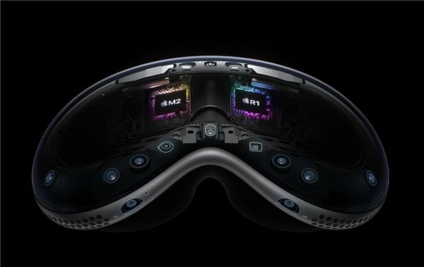 核心配置上,Vision Pro搭载M2芯片以及全新的R1芯片,R1芯片主要负责传输,官方称传输数据12毫秒就可以触达,比眨眼的速度还快——不清楚发热控制怎么样,不然变成蒸汽眼罩就不好玩了。
