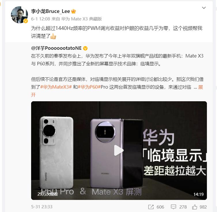 在华为终端BG CTO李小龙看来,超过1440Hz频率pwm调光对眼睛的收益为零,暗讽所谓“零风险”屏幕不如叫“零收益”。同时转发一段由一位博主科普华为Mate X3、华为P60系列的屏幕显示效果分析。