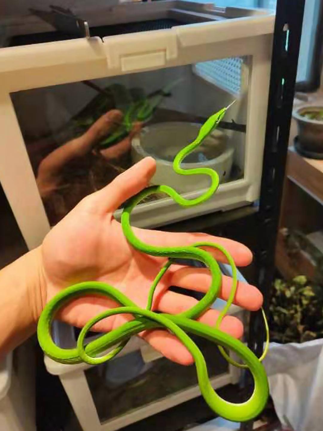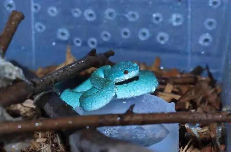 但张琨最爱的还是一条毒蛇——蓝色的海岛竹叶青,头部呈三角形,最早于印度尼西亚的一座海岛上发现,因为颜色特别在爬宠圈风靡一时。