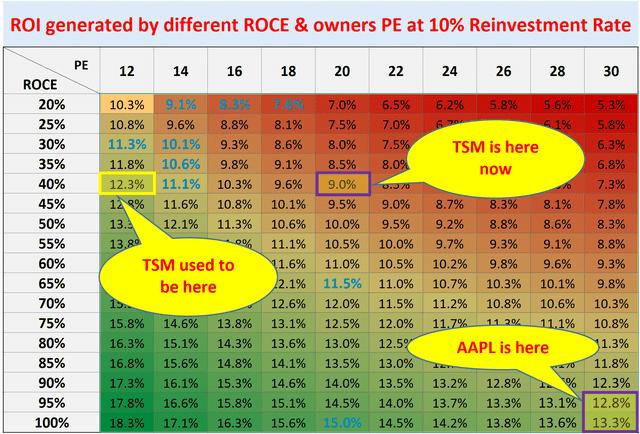 假设 RR 为 10%(10% RR * 42% ROCE = 4% 长期增长率),我预计 台积电 的长期增长率约为 4%。以 12 倍的市盈率计算,台积电 将提供约 8% 的收益收益率,从而导致每年约 12% 的总回报潜力。目前市盈率约为 20 倍,收益收益率已降至约 5%,总回报率下降至约 9%。相比之下,尽管 苹果 的市盈率较高,约为 30 倍,但由于其更高的 ROCE,它仍具有更高的长期回报潜力。