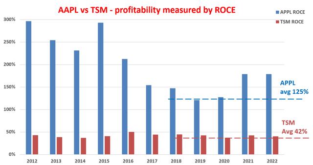 如前所述,台积电无疑是向上领域的规模领导者。如下图所示,它长期享有强劲且稳定的盈利能力。在这里,使用已动用资本回报率(“ROCE”)作为关键的盈利指标。也就是说,台积电的平均 ROCE 一直坚如磐石,过去十年平均约为 42%。一致性简直太棒了。