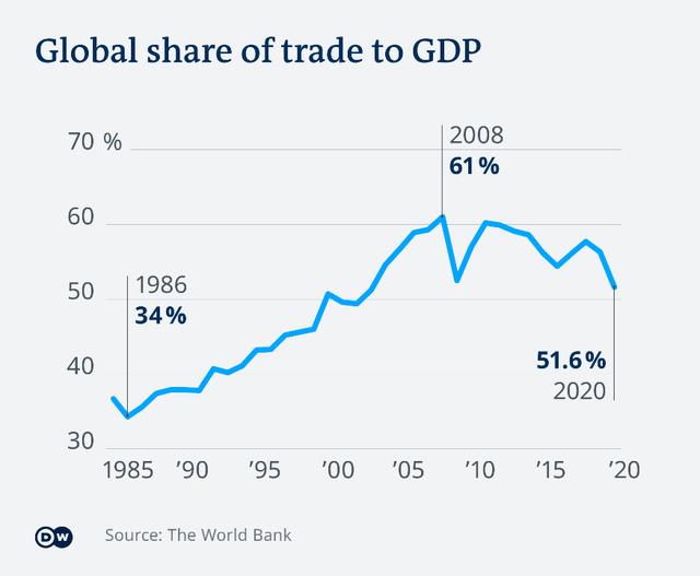 展望未来,台积电在错综复杂的全球芯片产业网络中的角色,仍然看到太多的不确定性。如下图所示,去全球化进程已成为一个发展了十多年的大趋势。也就是说,以总出口占全球 GDP 的百分比衡量的全球化自 2008 年达到顶峰以来一直在下降。该百分比已从 2008 年的 61% 下降到 2020 年的 51.6%。