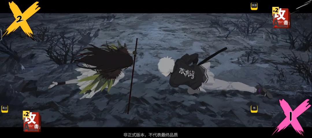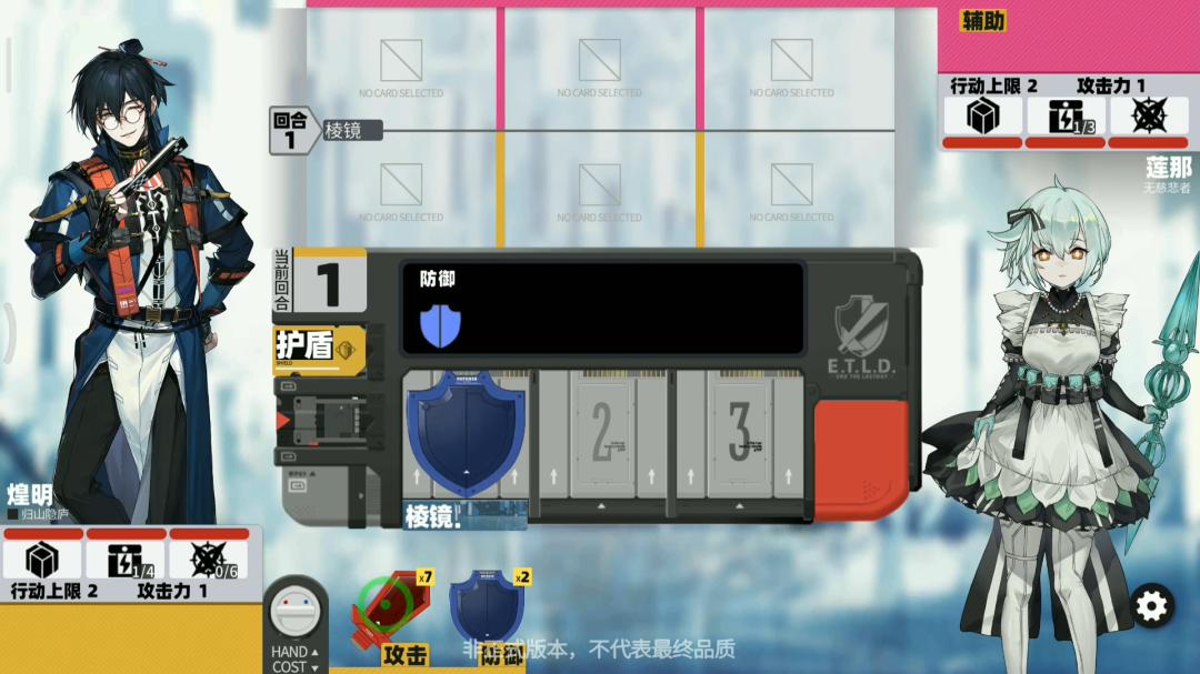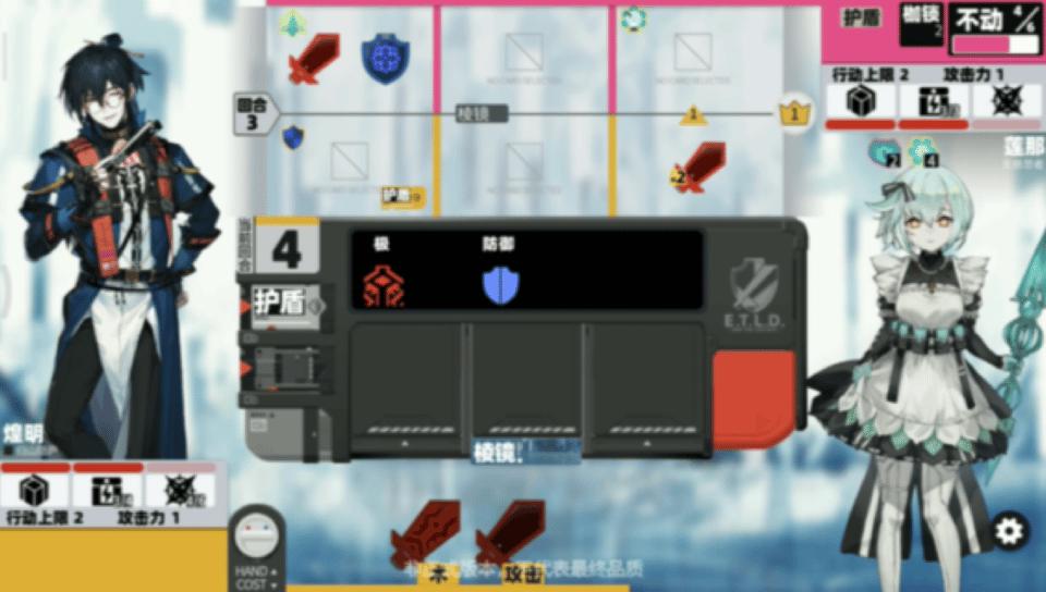 游戏的主要玩法,说得专业一点,是1v1实时策略对战;说得白一点,有点像是有出招次数限制的「石头剪刀布」,或是同时出牌、同时翻牌的卡牌对战游戏。玩家需要在每回合的三个行动区域里布置攻和防两类指令,来决定角色的行动。每回合角色对对方造成的伤害会转化为分数,分数高的一方在该回合胜出,一共赢下三个回合即获得最终胜利。