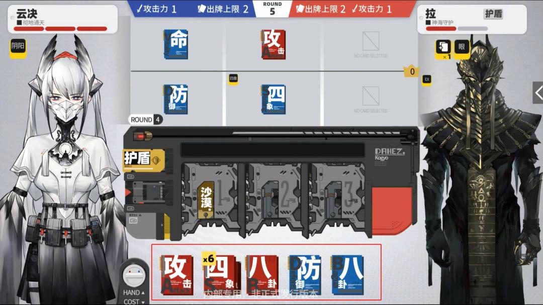 一方面,每回合能布置的指令以及每种指令的总数都存在上限;另一方面,游戏通过给角色赋予不同的技能特性,丰富了指令的具体种类。这些因素都能极大地丰富玩家的决策空间。例如下图中的角色「云决」,通过自身特性额外获得了许多无视上限的指令,指令效果也与普通攻防指令有所区别。就好像在「石头剪刀布」游戏里,满足一定条件就能获得一把「电钻」,连石头也能击碎。