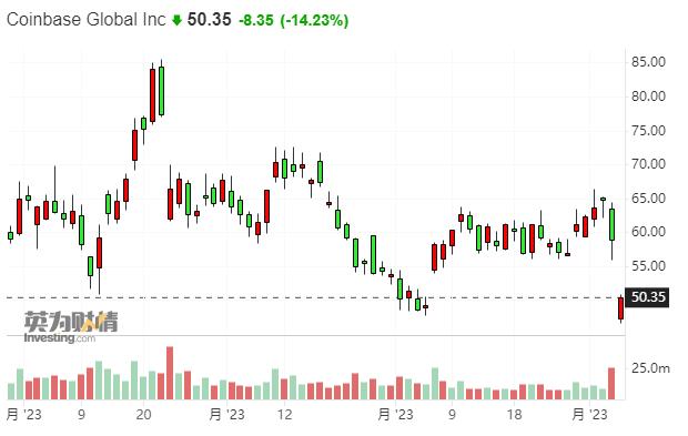 受这一消息的影响,截至发稿,在纳斯达克上市的Coinbase Global Inc股价跌超14%,报每股50.35美元,日内最低达到了46.48美元。