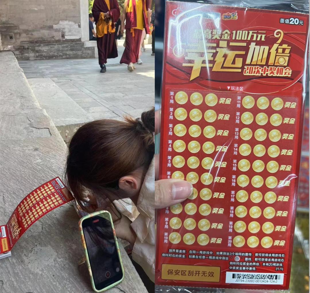 晓立在雍和宫里刮彩票 ,受访者供图
