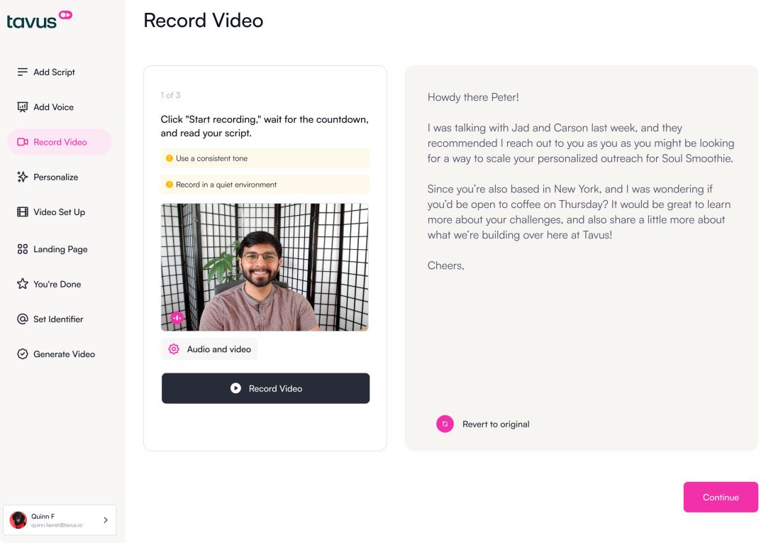 Tavus还通过ChatGPT生成的片段支持更长的变量,以帮助获得更个性化的介绍,Favret(Tavus联合创始人)表示这是用户强烈要求的功能。例如,用于创建视频的基本脚本可以配置为包含从特定个人的LinkedIn个人资料生成的一句话介绍。