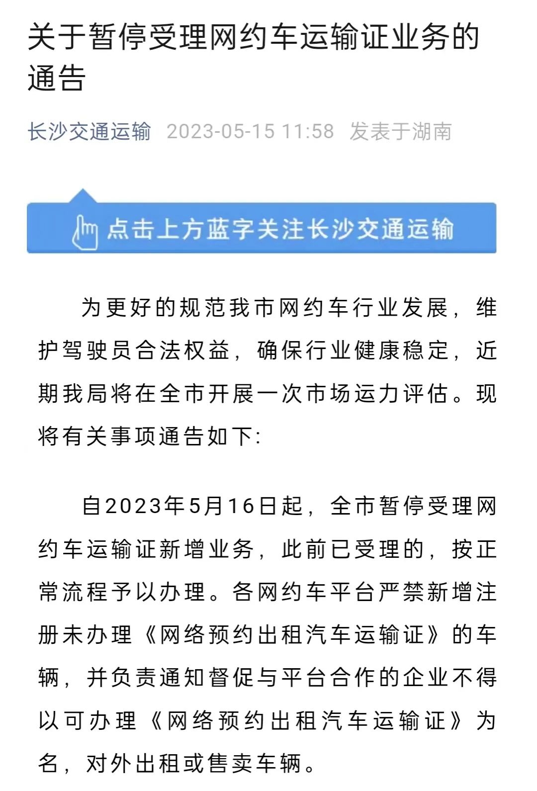 最近,长沙交通运输部门宣布,自 5 月 16 日起,暂停受理网约车运输证新增业务。