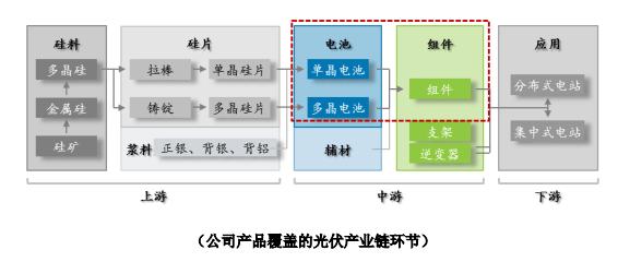 光伏产业链涵盖多晶硅料、硅片、电池片、组件以及电站五个环节,公司现有主营业务位于光伏产业链中游的电池片、组件环节,主营业务为高效太阳能电池片的研发、生产和销售,产品包括单晶PERC、多晶电池片等。