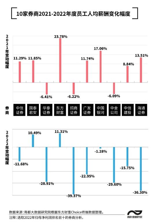 根据南都大数据研究院的一份总结显示,2022年头部券商的人均薪酬大部分出现了下降。