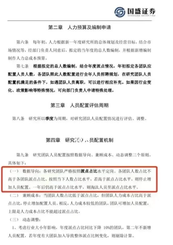 根据国盛证券的方案显示,其要求各研究团队需要根据派点水平来决定岗位名额,如果团队人数超过了派点占比,那么将停止增加人员配置,一年后仍然高于派点水平则需要对团队人员进行优化。