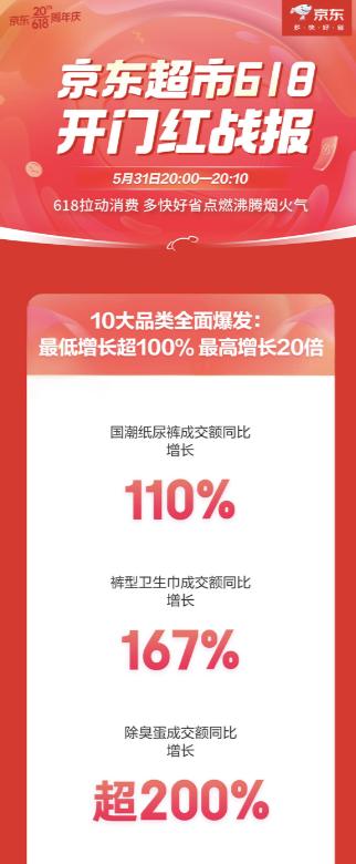 5月31日,京东又抢先发布618开门红10分钟(5月31日20:00-20:10)的销售战报。根据数据,开门红10分钟破亿的品牌数量与去年相比增加了23%,Apple品牌成交额1秒破亿,小米、荣耀、OPPO、vivo、华为、三星成交额同比增长均超100%。超六成的新商家10分钟成交额突破五月日均全天,近五成中小商家成交额增长超200%。