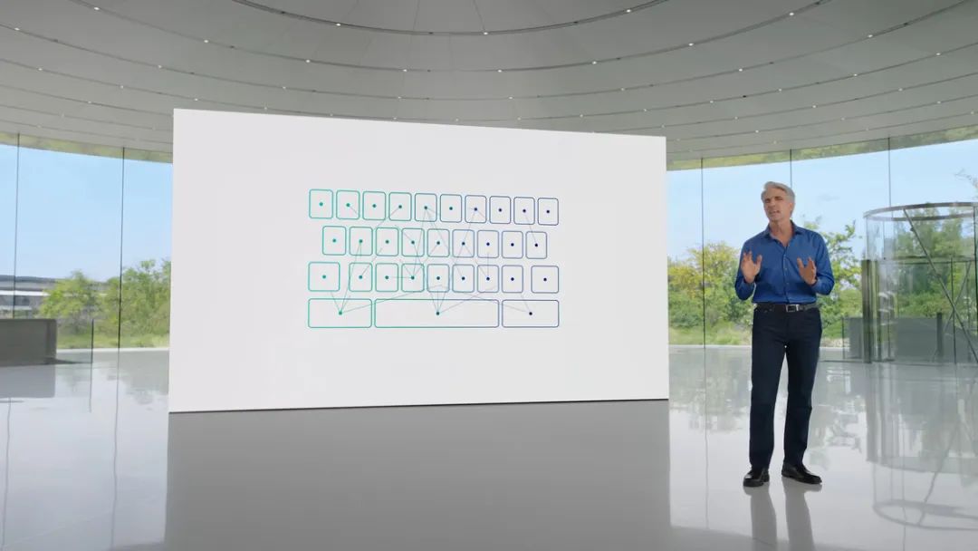 (27:30) 现在键盘可以通过Transformer 语言模型——也就是最前沿的单词预测模型 ——让自动纠正达到前所未有的准确度。 基于 Apple 芯片的强力驱动,每按下一个键 iPhone 就可以运行一次这个模型。 (讲到这里,Hair Force One 也颇有自嘲精神地承认,「如果你有时候真的就是想敲某个和 ducking 押韵的词,那手机也会记住」。 )