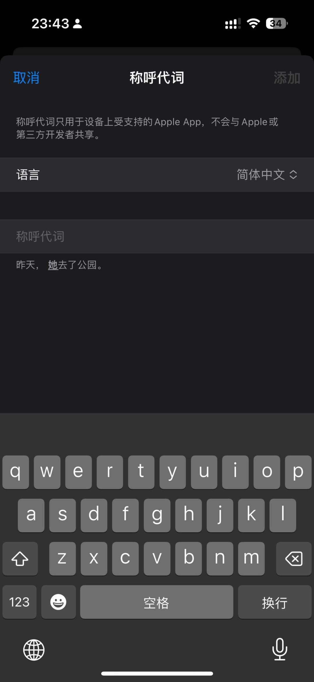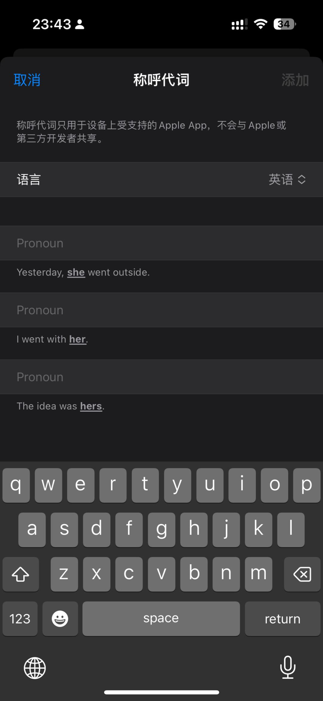 你可以根据自己的需要,提前在自己的联系人信息中设定好对应语言下的称呼代词偏好,同样的,你也可以根据实际情况为通讯录中的其他人添加称呼代词,用于提醒或后续分享均可。这样当你和其他人通过 NameDrop 交换名片后,对方就知道到底应该怎么称呼你了。
