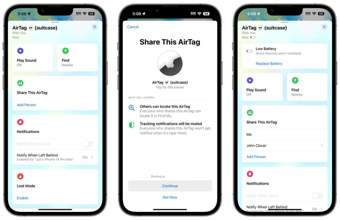 在此之前,AirTag 只能由一位用户使用,但在 iOS 17 中,这个功能将被开放给其它被拥有者邀请的联系人。