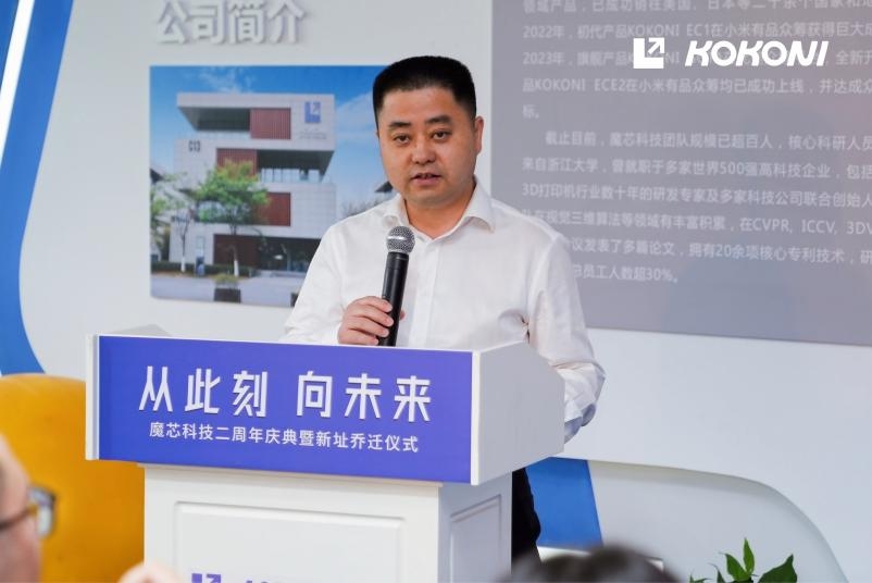 湖州莫干山高新区党工委委员、管委会副主任章洪春主任随后上台致辞,他代表湖州莫干山高新区为魔芯科技两周年送上了美好的生日祝福,同时对魔芯科技在消费科技领域做出的卓越贡献予以肯定,并表示将持续关注和支持企业发展,也对魔芯科技未来的发展抱有信心。