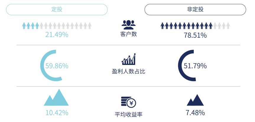 长期持有,低频交易,朴素的方法论获得了更好的收益。如此一来,能够淡化择时,帮助持有人降低波动的定投成了相对更好的选择。与非定投基民相比,采取定投策略的基民无论是盈利人数占比还是平均收益率,都要更胜一筹。