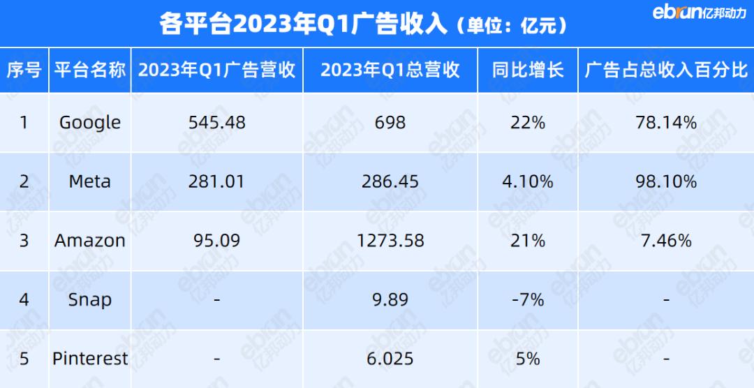 该季度中,Meta广告收入恢复至281.01亿美元,同比增长4.1%;Google母公司Alphabet广告营收545.48亿美元,同比增长22%;亚马逊广告业务收入同比增长21%至95.09亿美元;Pinterest这样相对小众的社媒平台营收也同比增长5%至6.025亿美元。