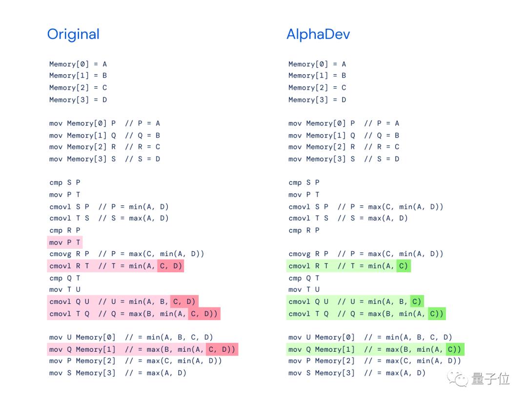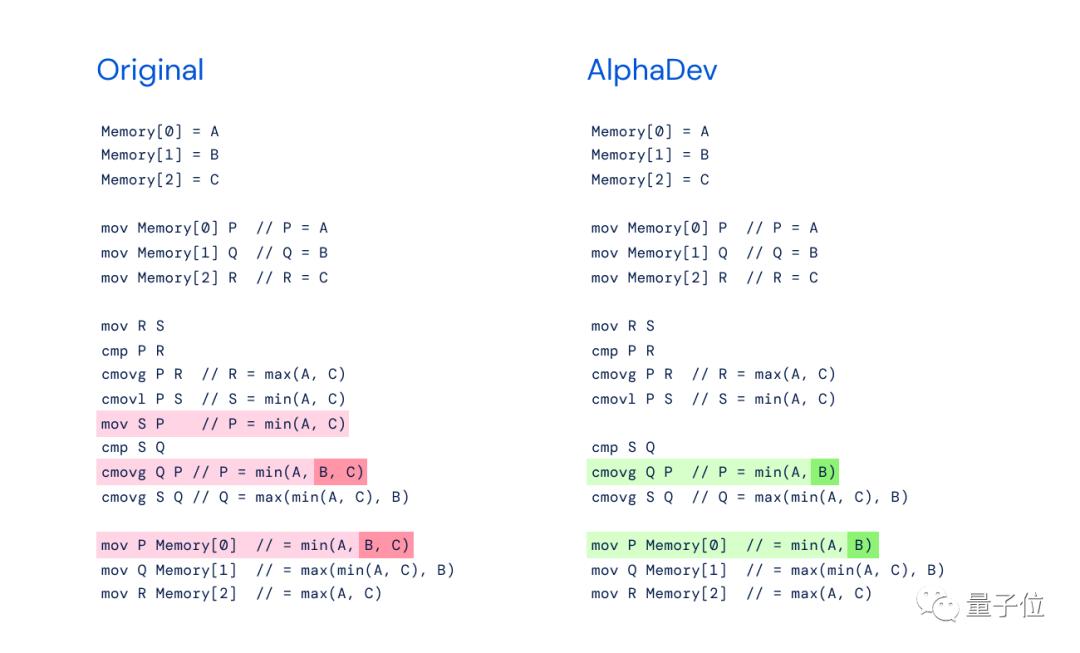 同样,AlphaDev则是通过交换和复制移动,跳过了一个步骤,以一种看似错误但实际上是捷径的方式达成目标。