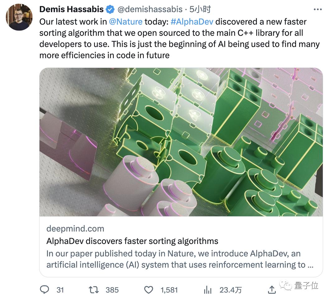 论文地址:https://www.nature.com/articles/s41586-023-06004-9官方博客:https://www.deepmind.com/blog/alphadev-discovers-faster-sorting-algorithms?utm_source=twitter&utm_medium=social&utm_campaign=OCS