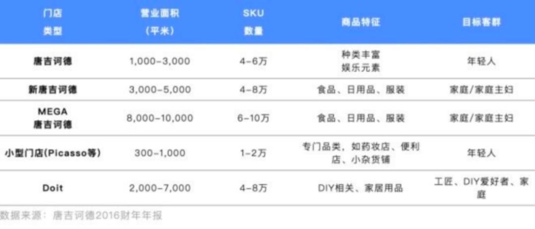 MEGA唐吉诃德(2007年收购长崎屋后改造而成。后者在肉类和鱼类销售上的资源和经验,使得唐吉诃德顺利开拓生鲜品类):面积3000-10000平米,4-10万个SKU(包括服装),其商品种类、陈列、购物通道设计更符合家庭客群需求。