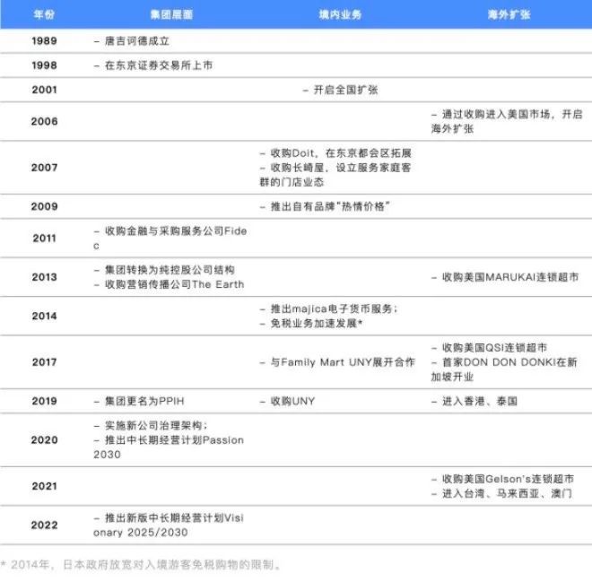 在美国,唐吉诃德于2006年收购日本大荣零售Daiei的美国业务DQUSA,进入夏威夷;2013年起又陆续收购了Marukai、QSI、Gelson’s等连锁超市。在东南亚,2017年在新加坡开出日本以外的亚洲首店;2019年,进入中国香港、泰国;2021年进入中国台湾、马来西亚、中国澳门等国家和地区。