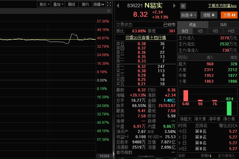 今日N易实(836221)在北交所上市,并从新三板摘牌。开盘价格7.50元/股。截至收盘,易实精密上涨39.13%,收盘价8.32元/股,换手率66.55%,成交量达1.40亿,总市值7.821亿元。