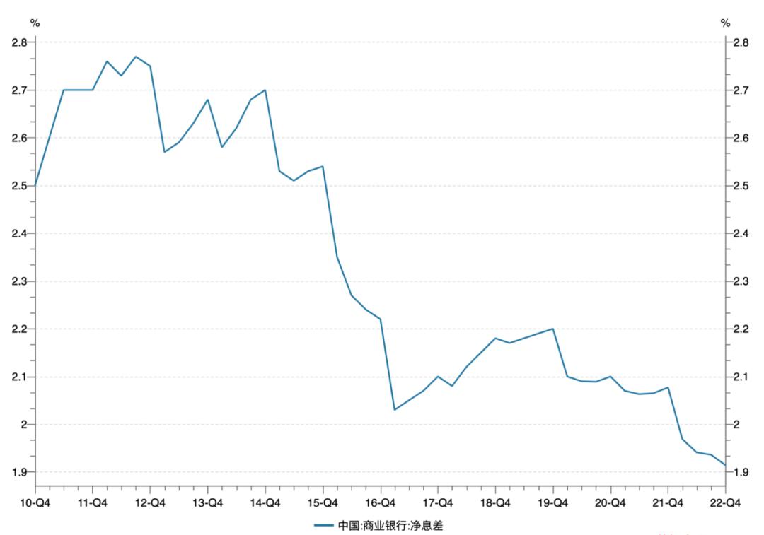 这背后是近年来银行逐渐显露的息差压力。 银保监会数据显示,2022年底,商业银行整体净息差为1.91%,同比下降17个基点,这是自2010年以来净息差首次跌破2%。