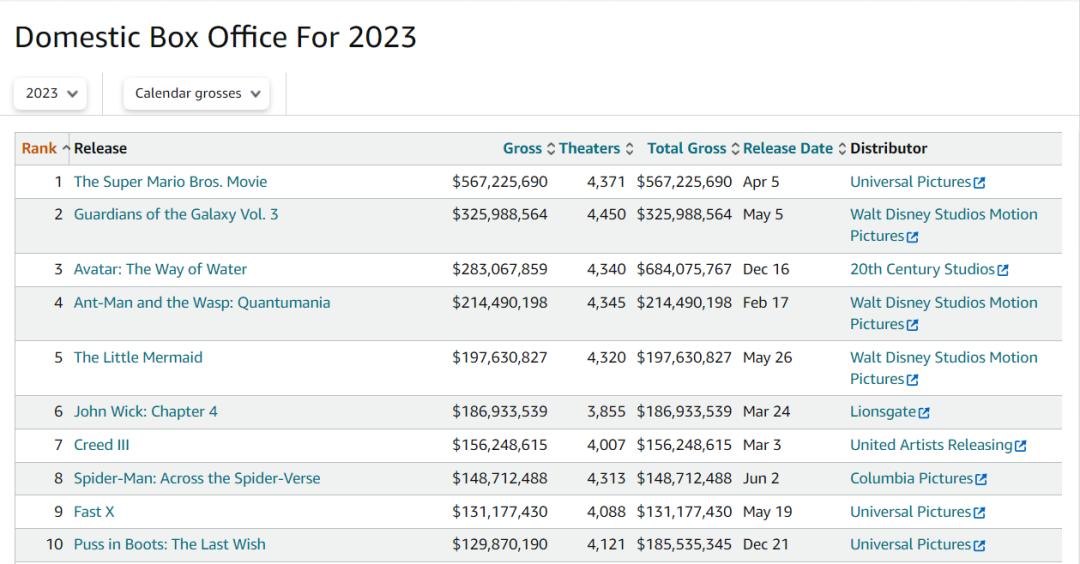 到目前为止,今年北美票房前十的电影,无一例外全部是系列电影或IP改编,其中票房最高的前三位是《超级马力欧兄弟大电影》《银河护卫队3》和《阿凡达2:水之道》;而迪士尼的优势似乎也并没有那么明显,10部电影中占据3席。