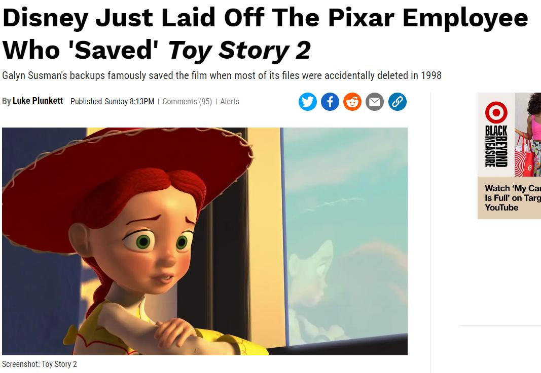 其次是级别上,被裁员的高管包括皮克斯全球传播副总裁迈克尔·阿古内克,以及电影《光年正传》的导演安格斯·麦克莱恩以及制片人加林·苏斯曼;其中苏斯曼是乔布斯时代以来的“传奇人物”——他曾在《玩具总动员2》文件数据全被误删的时候,在家中找到了电影备件,救了整部电影。