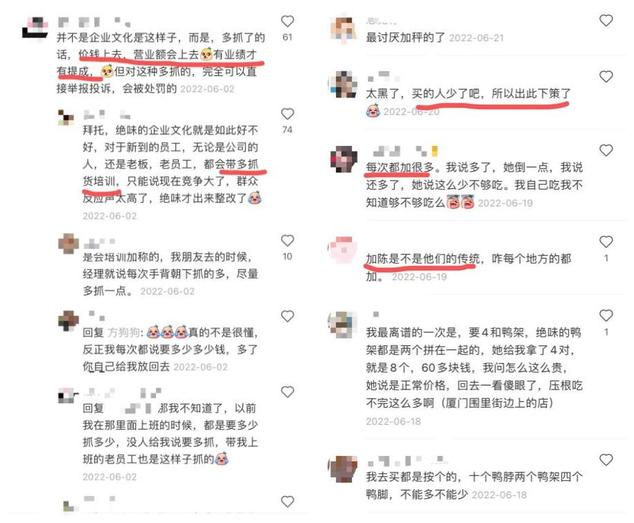 小红书等社交平台上,网友们分享真实遭遇的同时,也吐槽称“加秤是绝味的传统”,还有网友则表示:“公司内部就有多加秤培训,引导多抓,增加营业额”。