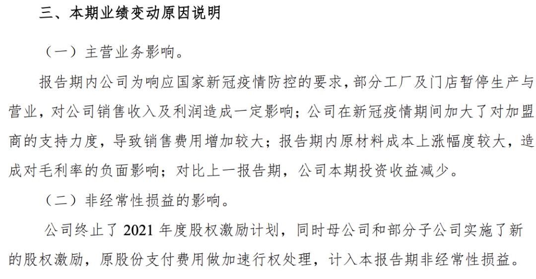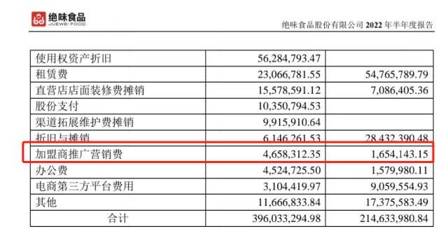 对于业绩大幅下降,绝味食品在业绩预告中主要归结于疫情、成本上涨等因素,此外,绝味食品还加大了对加盟商的支持力度,导致销售费用增加较大。