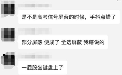 还有人以开玩笑似的猜测是不是电信的工作人员在部署高考信号屏蔽时,不小心点了全局屏蔽。当然,这个就肯定是笑话了,先不说一些地区使用的是信号屏蔽车,而且高考的信号屏蔽是连网络信号都关闭的,并不会出现能上网却不能打电话的情况。
