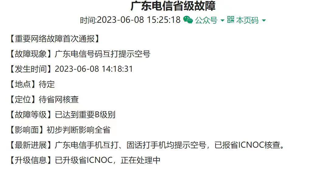 关于此次电信的故障,官方暂时还没有给出原因,目前在网上只能看到一些电信员工的回复以及故障通知书,在一则通知中写到,首次故障通报的时间是下午的15时25分,而故障发生时间则是下午14时18分,故障等级达重要B级(现在估计已经提高到了A级)。