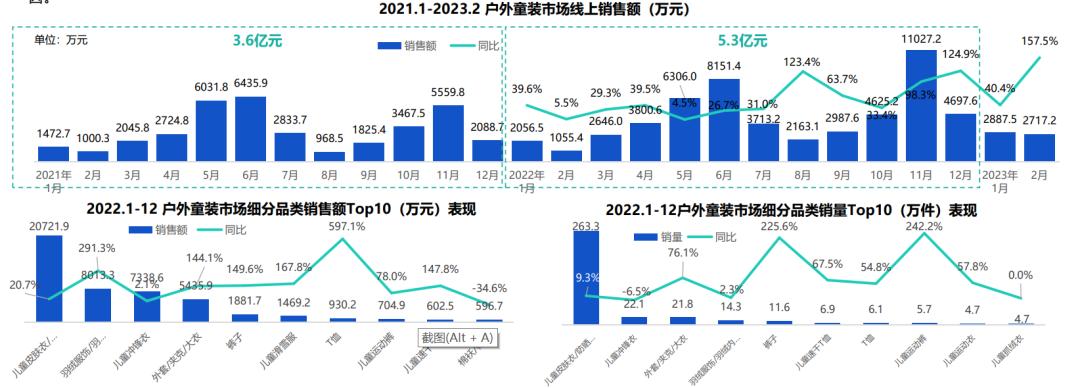 The North Face开店的举动,成了2022年国内户外童装赛道快速增长的直接体现。根据魔镜市场情报的数据,2022年1-12月,天猫户外童装市场累计销售额达5.3亿元,同比上升46%。