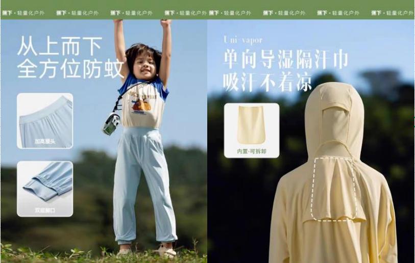 ▲诺诗兰童装早期曾和钓鱼品牌合作,将后者的核心防蚊面料用在夏季衣物上,反响不错。