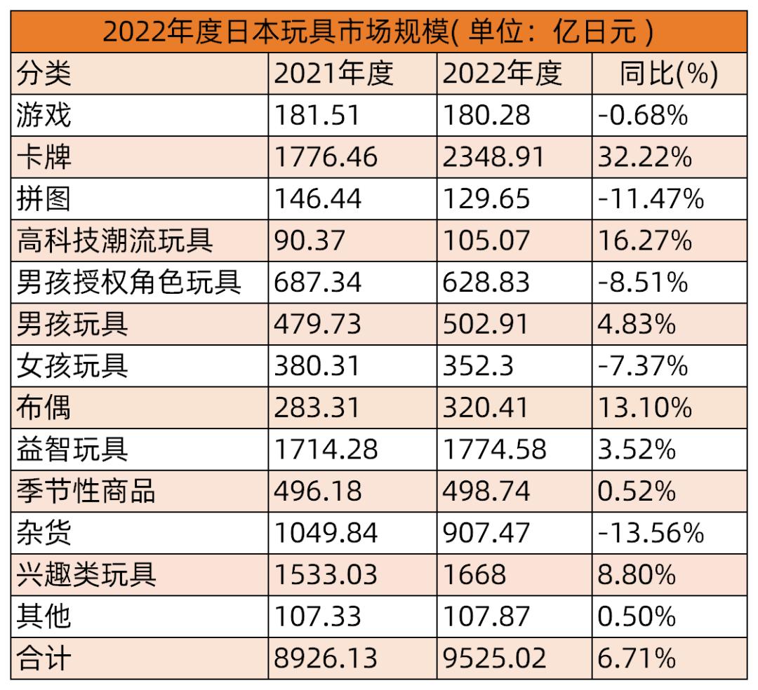 这一年度,日本国内玩具市场规模达9525亿日元,同比增长6.7%,这是日本玩具协会开始市场调查以来的最高金额。也首次突破9000亿日元大关。