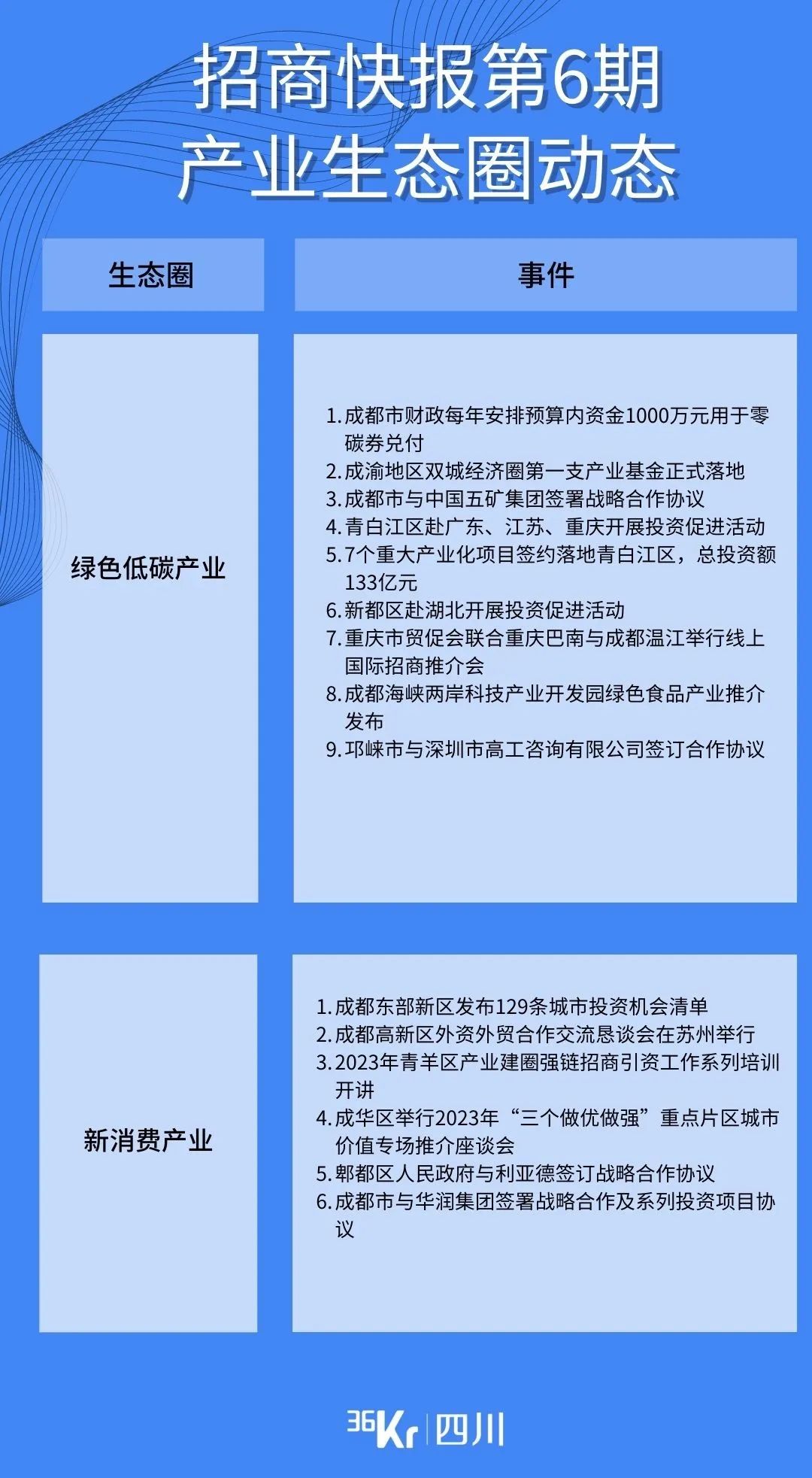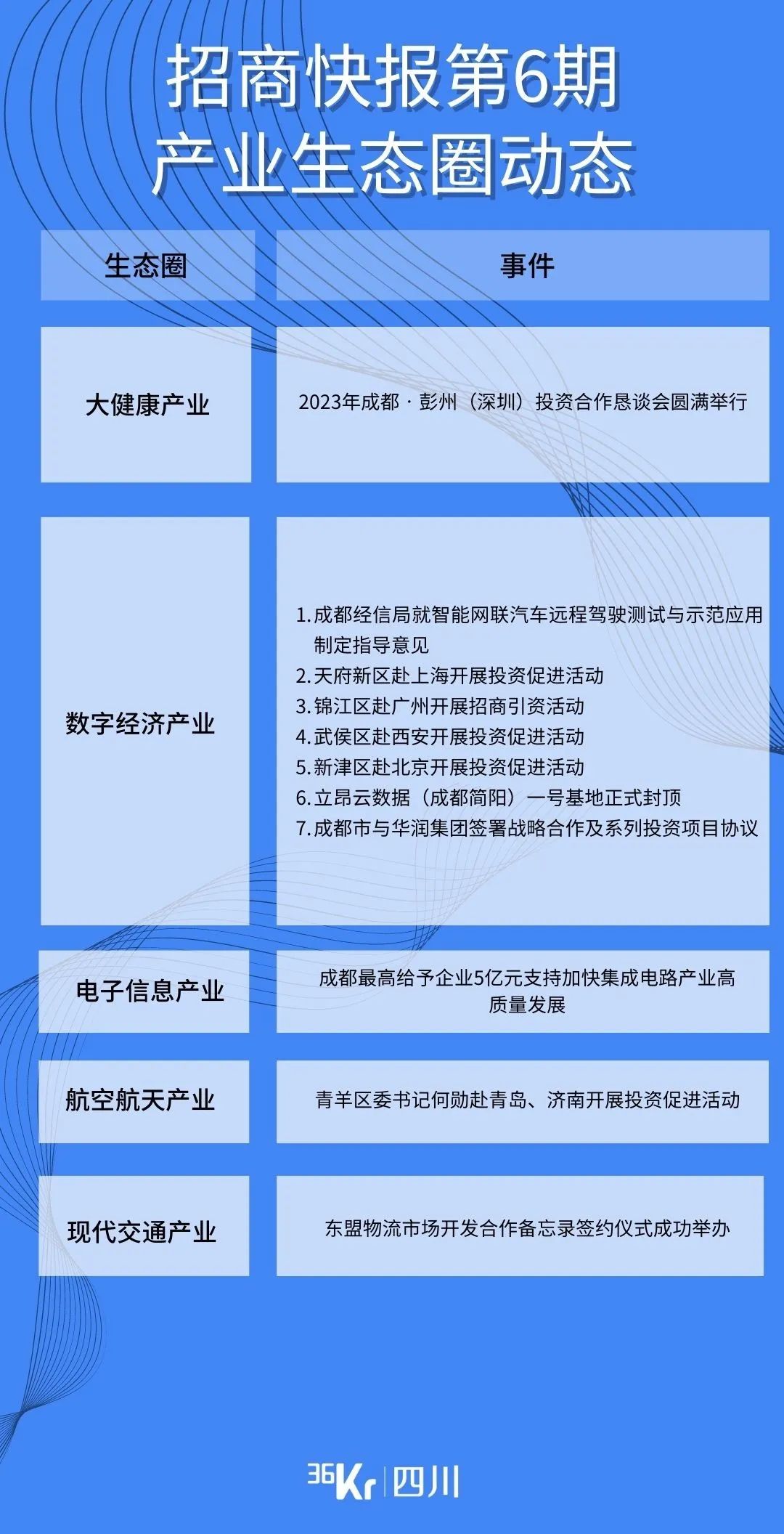 2023年6月8日,36氪四川通过公开渠道,共收录与成都市23个区(市)县相关的招商资讯、政策信息27条。