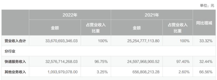 财报数据显示,2022年,申通快递完成快递业务量129.47 亿件,同比增长 16.89%;市场占有率为 11.71%,同比上升 1.48 个百分点;实现营业收入 336.71 亿元,同比增长 33.32%。