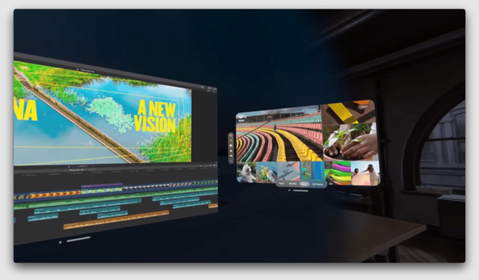 当然你也可以用键盘和触控板,通过蓝牙连接,你也可以将 Mac 投影到 Vision Pro 上;在 Photos 左侧有一台运行 Final Cut Pro 的 Mac,上面显示了该屏幕截图的完整版: