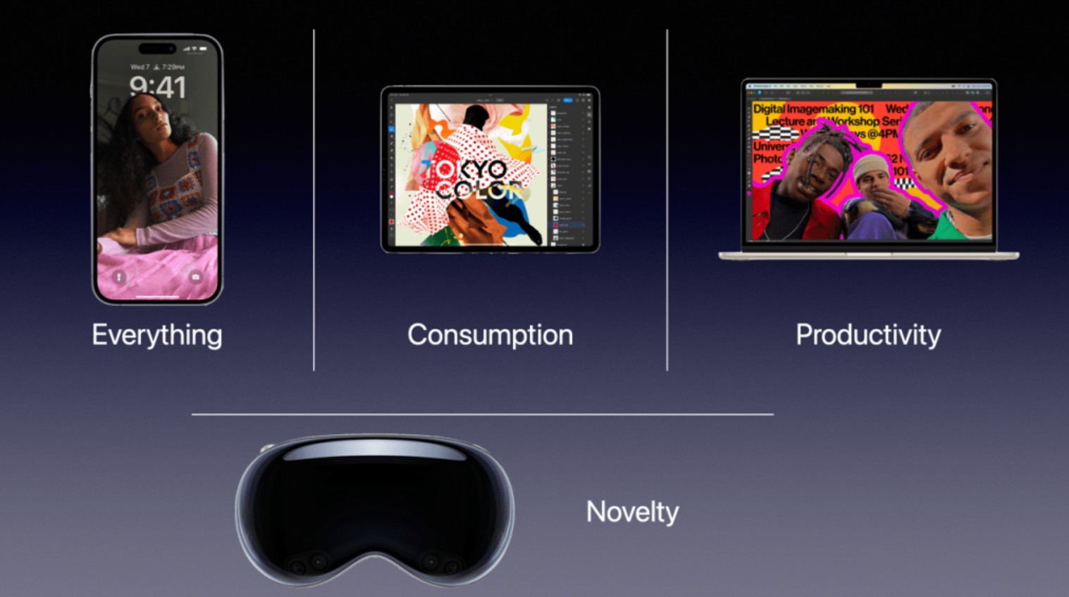 批评者是有理由的,这将是 Apple Vision 在开始时所面临的挑战:许多早期购买者可能是由于对其新颖性感兴趣,或者由于他们是苹果的超级粉丝,所以有理由怀疑 Vision Pro 是否会成为全世界最昂贵的装饰品。用一张乔布斯幻灯片的更新版来说: