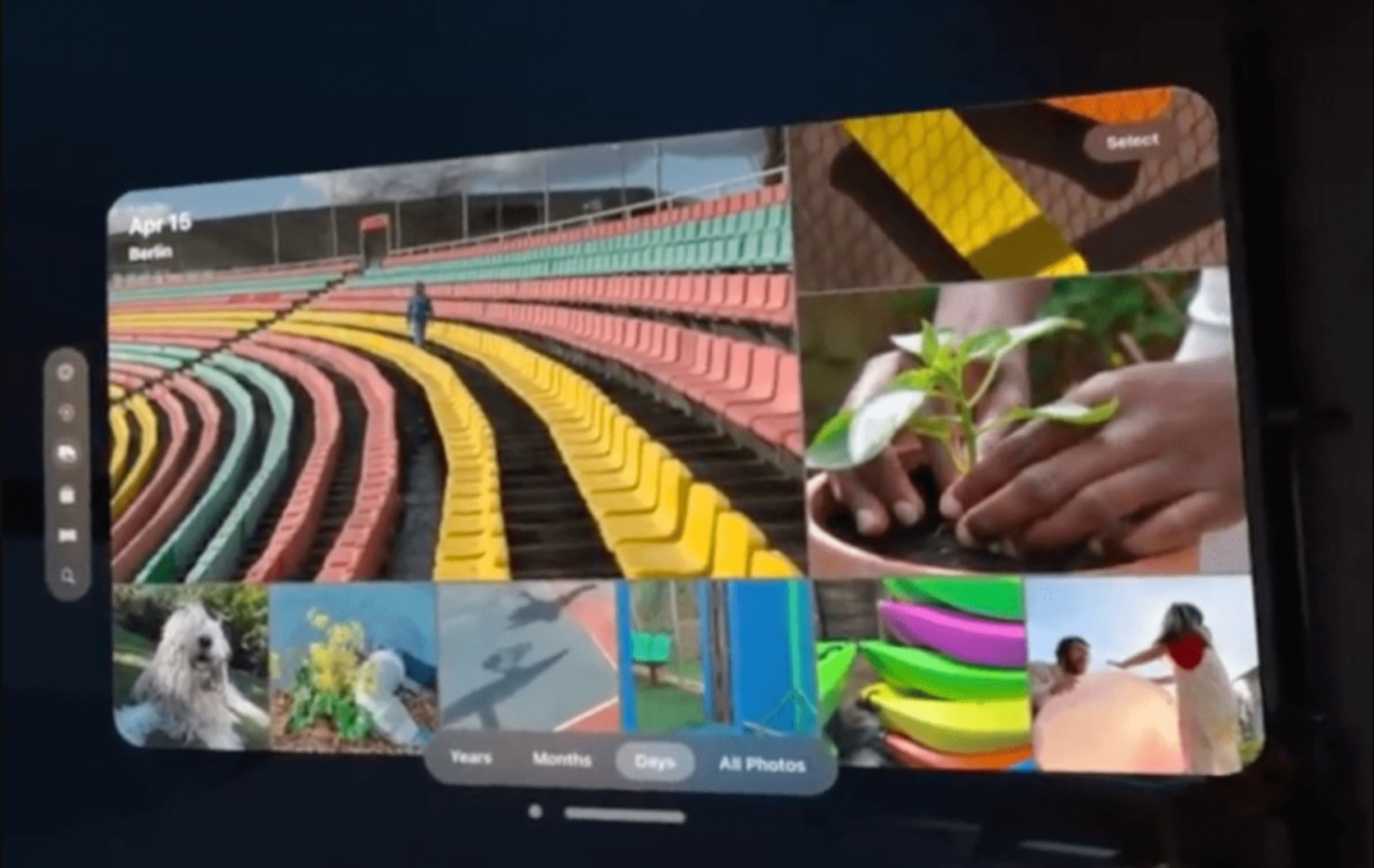 Photos 底部的那道杠你“抓取”后就可以将 Photos 移动到任何地方(字面意义上);那道杠旁边的小点可以关闭应用。左侧是照片特有的各种菜单项。值得注意的是它们有多小:这可不是像 iOS 或 iPadOS 那样必须适应粗大手指的用户界面;相反,visionOS 的眼球追踪非常准确,可以轻松标示出你正在查看的确切用户界面元素,同样地,你只需将手指并拢即可触发那些元素。所以很特别,而且效果非常好。