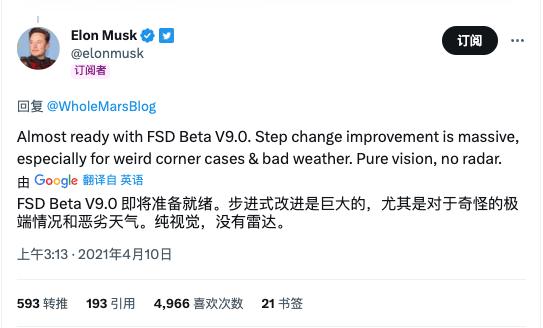 马斯克也透露,FSD 将在 4 月份将发布下个重要版本,取消雷达的使用,采取纯粹的视觉方案,并称其为「是通向现实世界 AI 的途径(This is the way to real-world AI)」。由此,马斯克计划在 4 月发布的新版本——FSD Beta V9.0,被给予厚望。