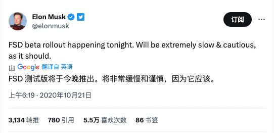 因此,一直到 2020 年 10 月 21 日,马斯克才宣布,在当地周二晚开始向美国的极少部分用户推送 FSD Beta 测试版本——这是自他本人宣布 FSD 以来,首次对外推出测试版本。