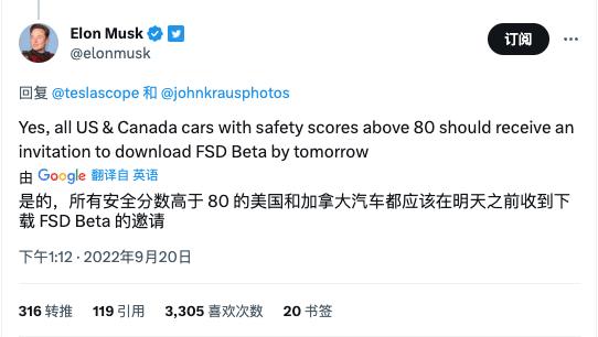 2022 年 9 月,特斯拉推送 FSD Beta V10.69.2.2 时,马斯克宣布北美地区参与 FSD Beta 测试用户超过了 16 万。而这时,北美地区的驾驶员只要驾驶里程超过 100 英里,且安全评分在 80 分以上就有资格获得最新 FSD Beta 版本的推送。