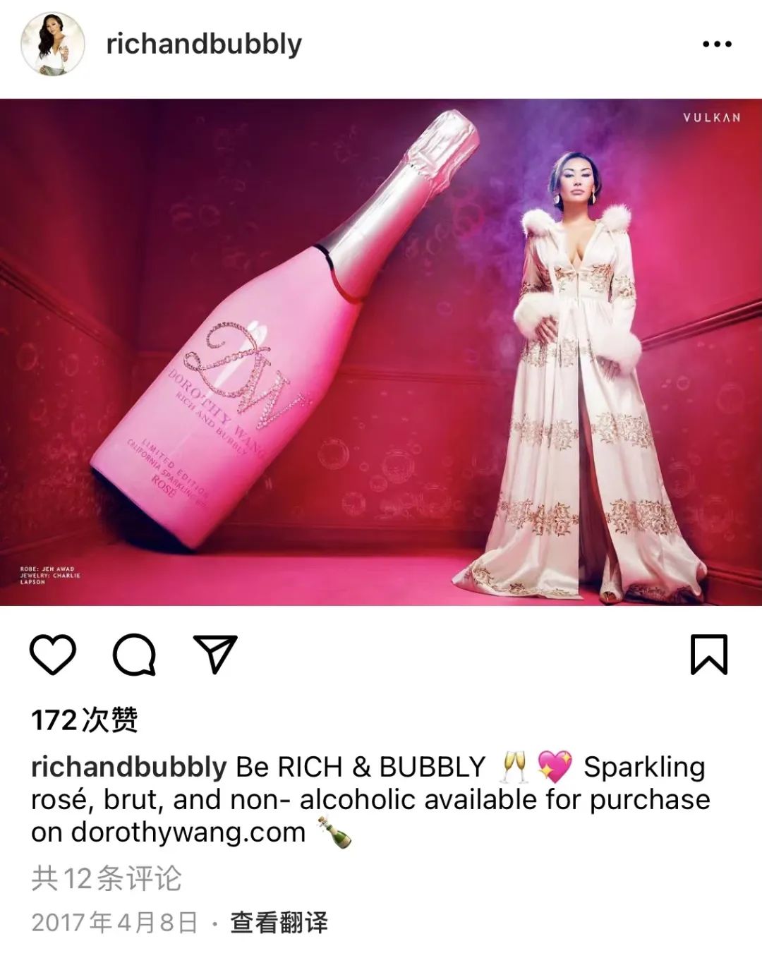 在接受媒体访问时,她也摆着自家香槟,ins上也是铺天盖地的打广告。2017年,她还晒出过一张由自己担当模特的广告硬照,没成想成了该品牌的绝唱,香槟生意也只持续了两年。