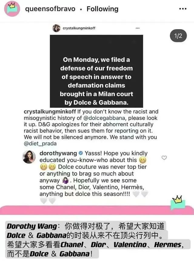 前些年,杜嘉班纳辱华被抵制一年后,D&G起诉当时的爆料者,还要索赔400万欧元。王宣琳就亲自下场在社交媒体上霸气输出:
