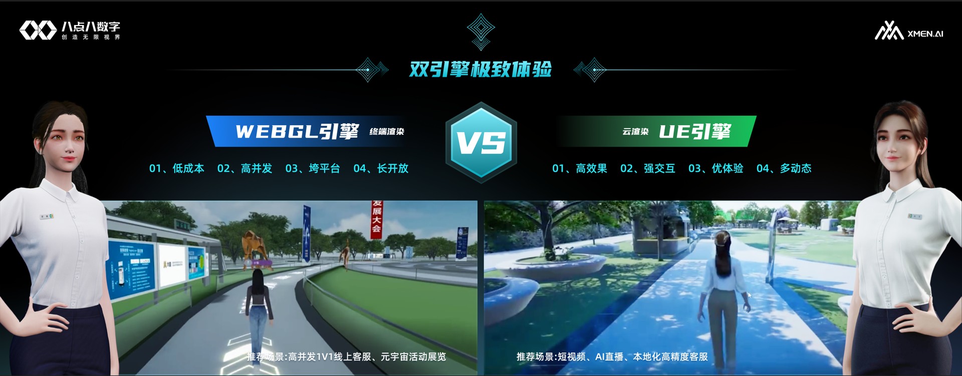 核心产品方面,凭借多年来服务G端、B端客户的经验,八点八数字推出国内首个双引擎渲染架构的虚拟人内容生成引擎-XMEN.AI。企业客户能够借助XMEN.AI快速生成虚拟人短视频、开启虚拟人AI直播、部署ChatGPT对话机器人、开展元宇宙活动展览等,是国内首家打通虚拟人元宇宙全场景应用的引擎产品。通过双引擎混合渲染架构,XMEN.AI既能满足虚拟人视频直播内容的电影级超精度画质输出,又能满足对话机器人、元宇宙活动展览等场景的零成本高并发渲染。